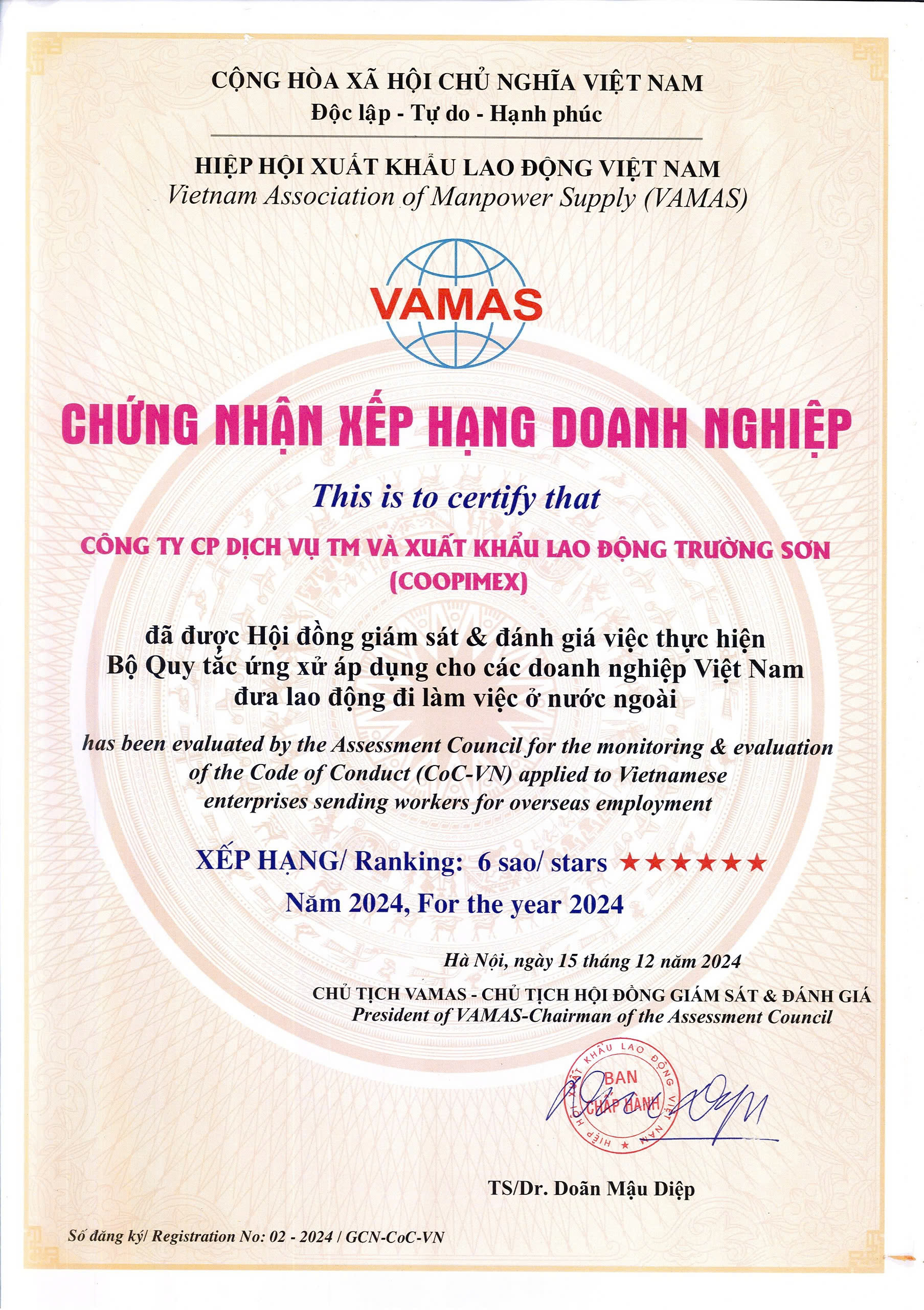 Doanh nghiệp với bề dày kinh nghiệm về lĩnh vực XKLĐ trong 25 năm qua, luôn giữ vững thương hiệu, uy tín và chất lượng hiệu quả cao. Công ty chúng tôi được Hiệp Hội Xuất Khẩu lao động đánh giá  “Chứng Nhận Xếp Hạng Doanh Nghiệp Sáu Sao” trong hai năm liên tiếp 2023-2024